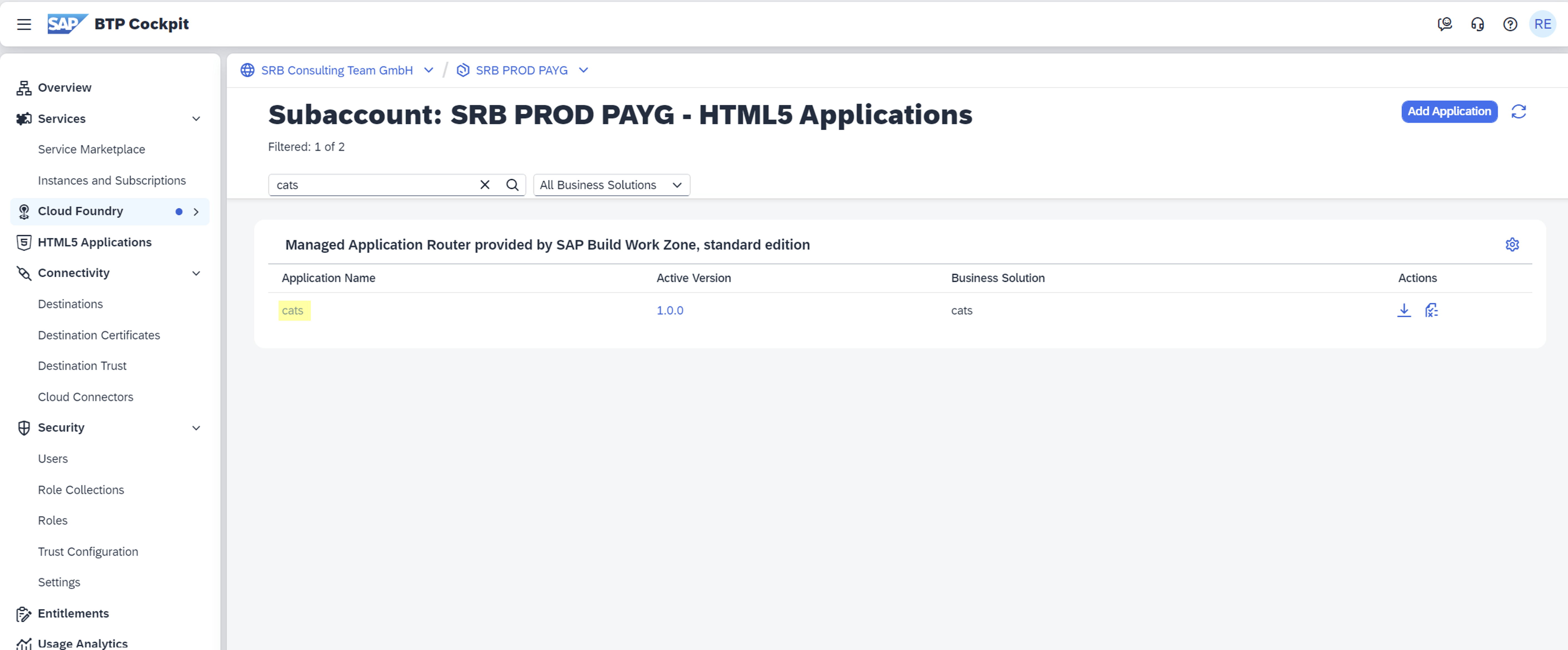 Das Deployment der Anwendung in das BTP Cloud Foundry Subkonto erfolgte mit npm run deploy.