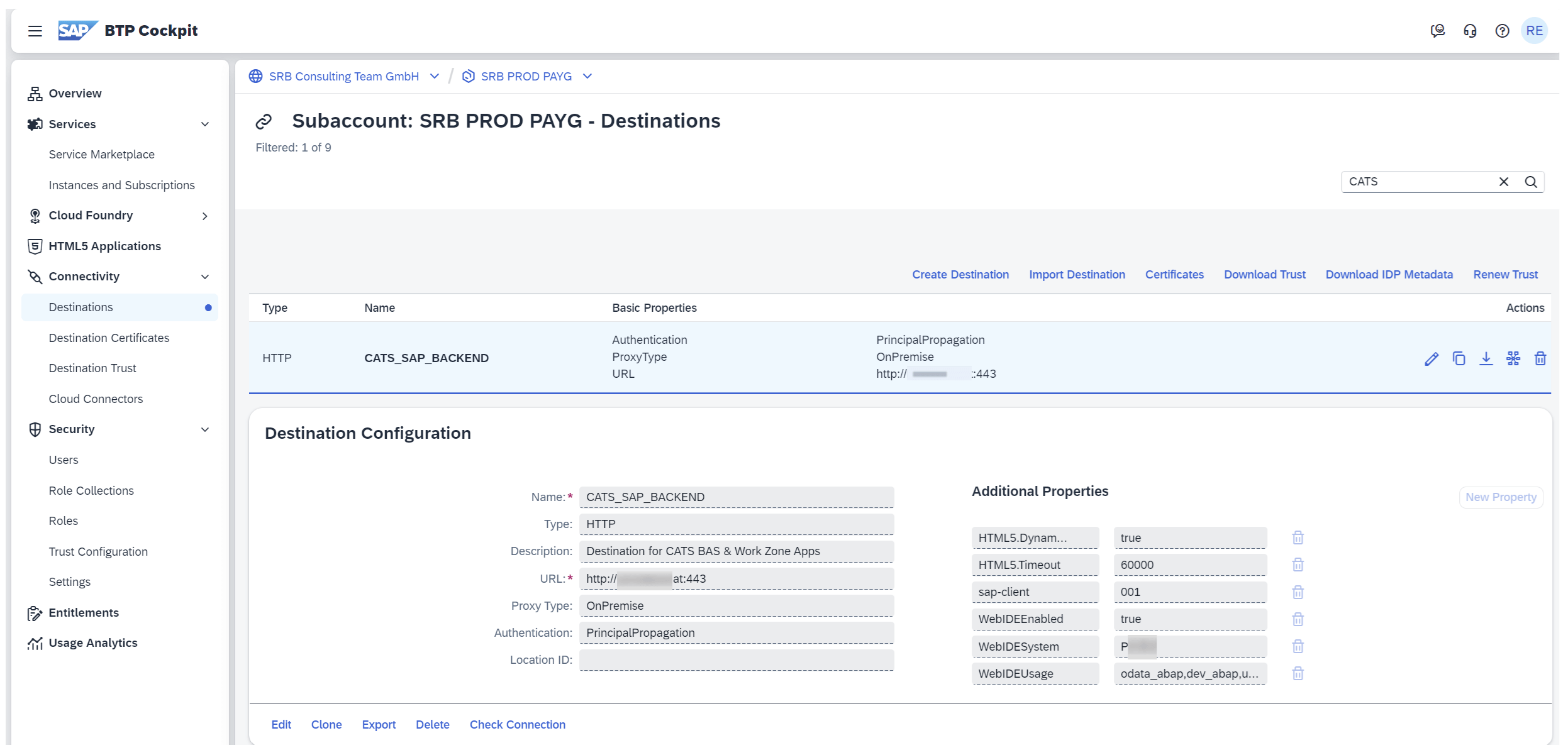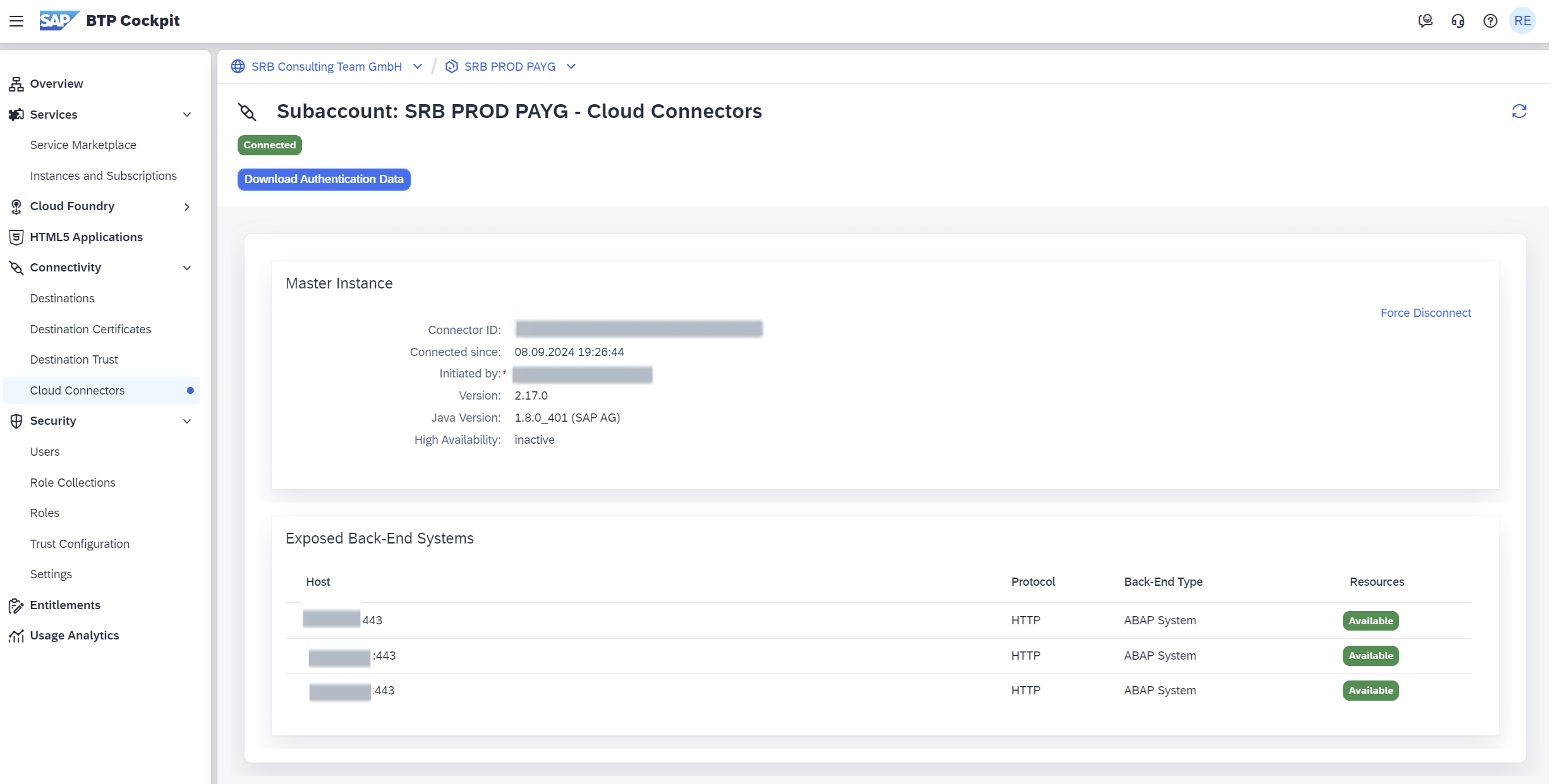 - On-Premise Cloud Connector Anbindung für Principal Propagation vom BTP-Subkonto zu SAP ABAP On-Premise Backend (S/4HANA) sind eingerichtet: