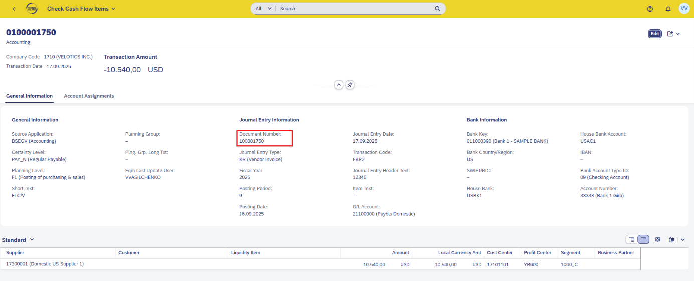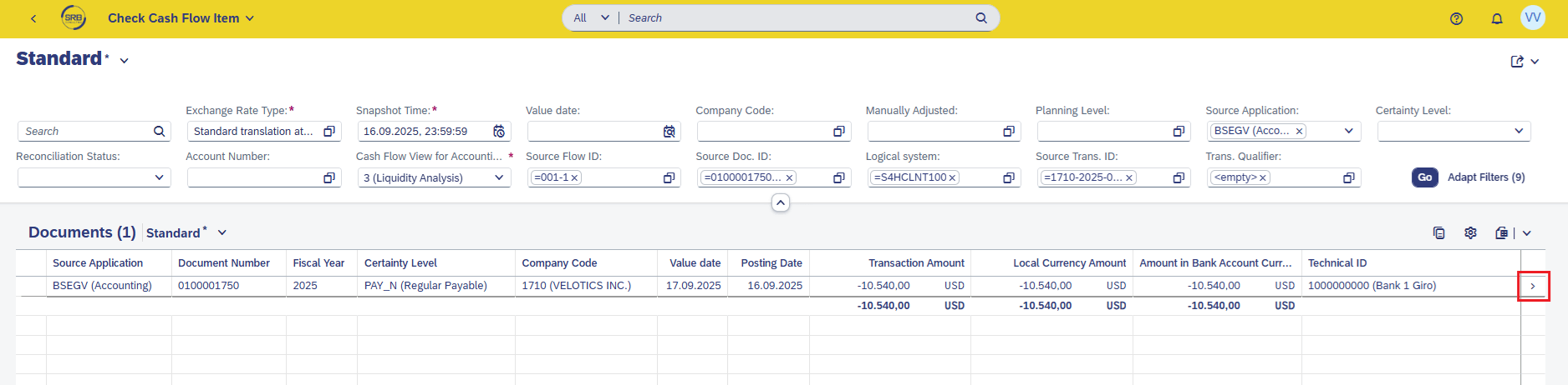 4.    Navigation zu den Cashflow-Details zur Prüfung der zugehörigen Ursprungsbelege. Dabei gibt es die Möglichkeit, sowohl aggregierte Summen als auch detaillierte Daten zu einzelnen Positionen anzuzeigen. Mit einem Klick auf eine Zeile mit einer Summe reicht, um die andere App Check Cash Flow Items durchzuführen können, um die FI-Belege anzusehen.