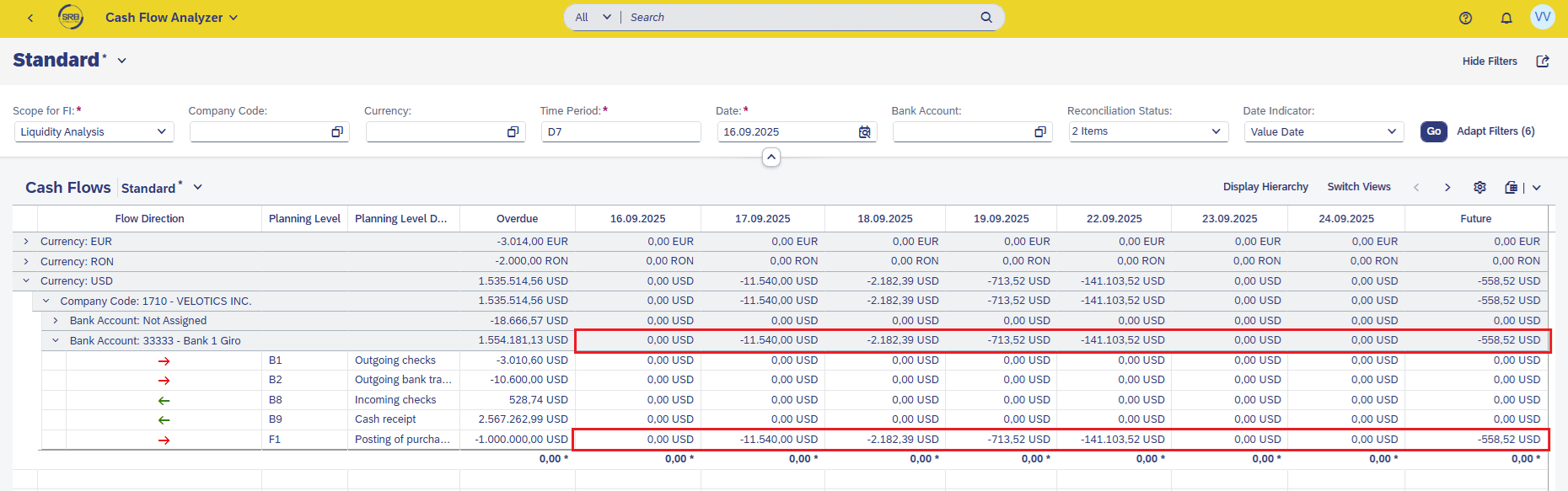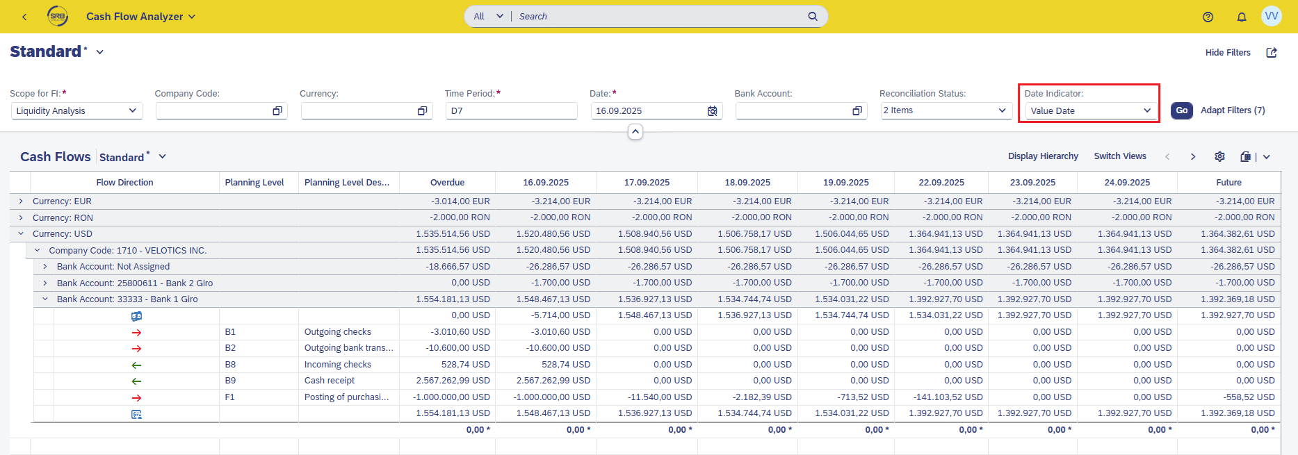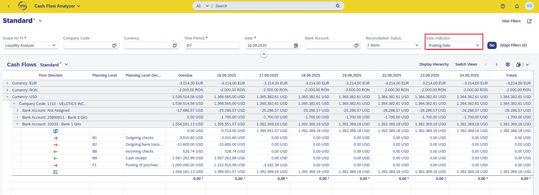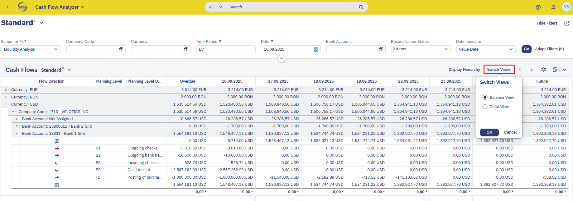 Delta View (Deltasicht) stellt ausschließlich die Netto-Cashflows (Inflows und Outflows) des gewählten Zeitraums dar, ohne Saldenfortschreibung.