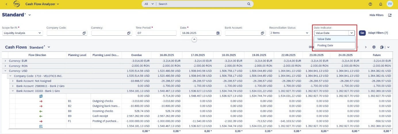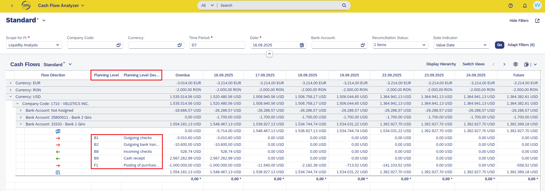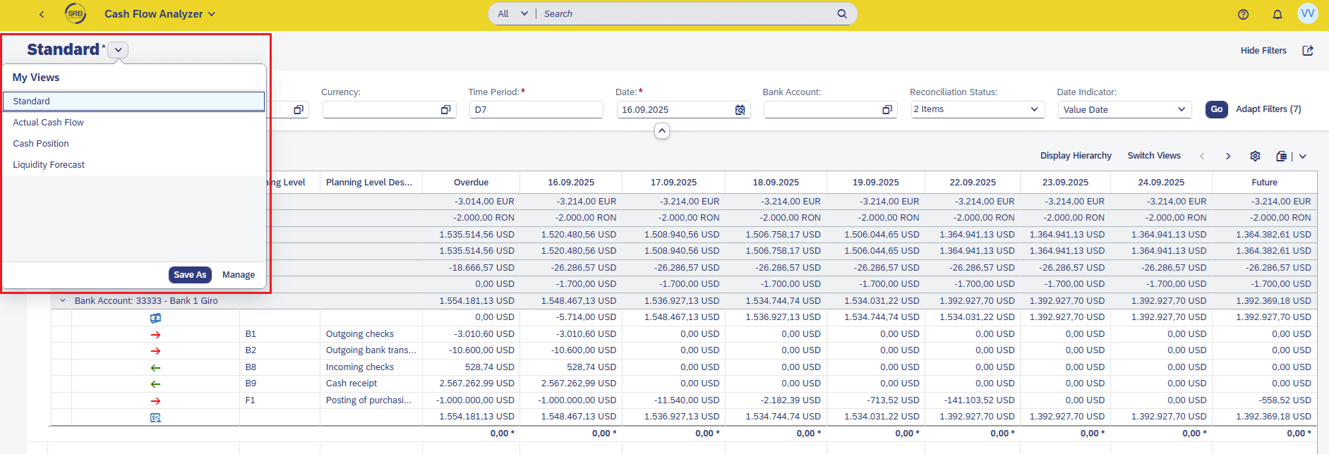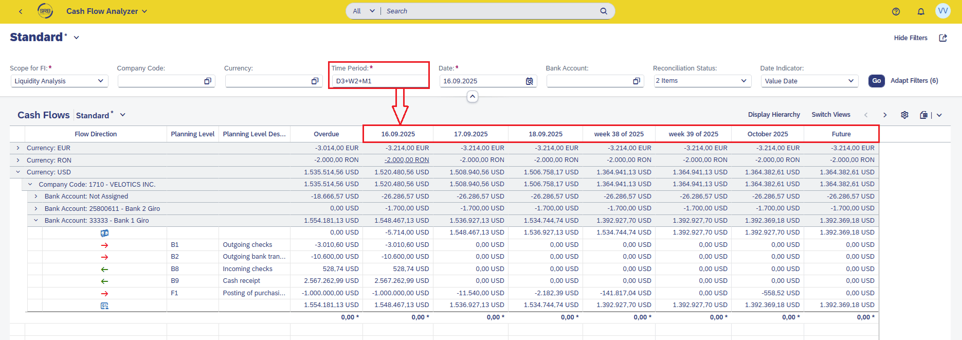 Delta View (Deltasicht) stellt ausschließlich die Netto-Cashflows (Inflows und Outflows) des gewählten Zeitraums dar, ohne Saldenfortschreibung.