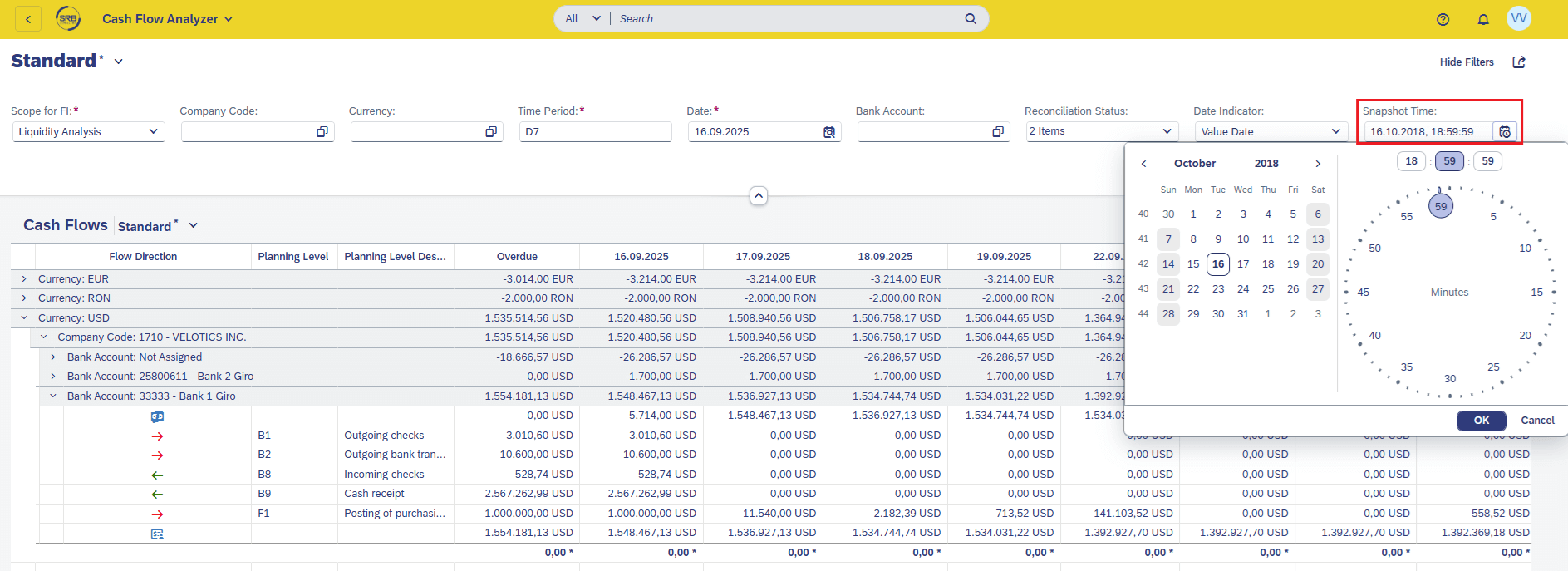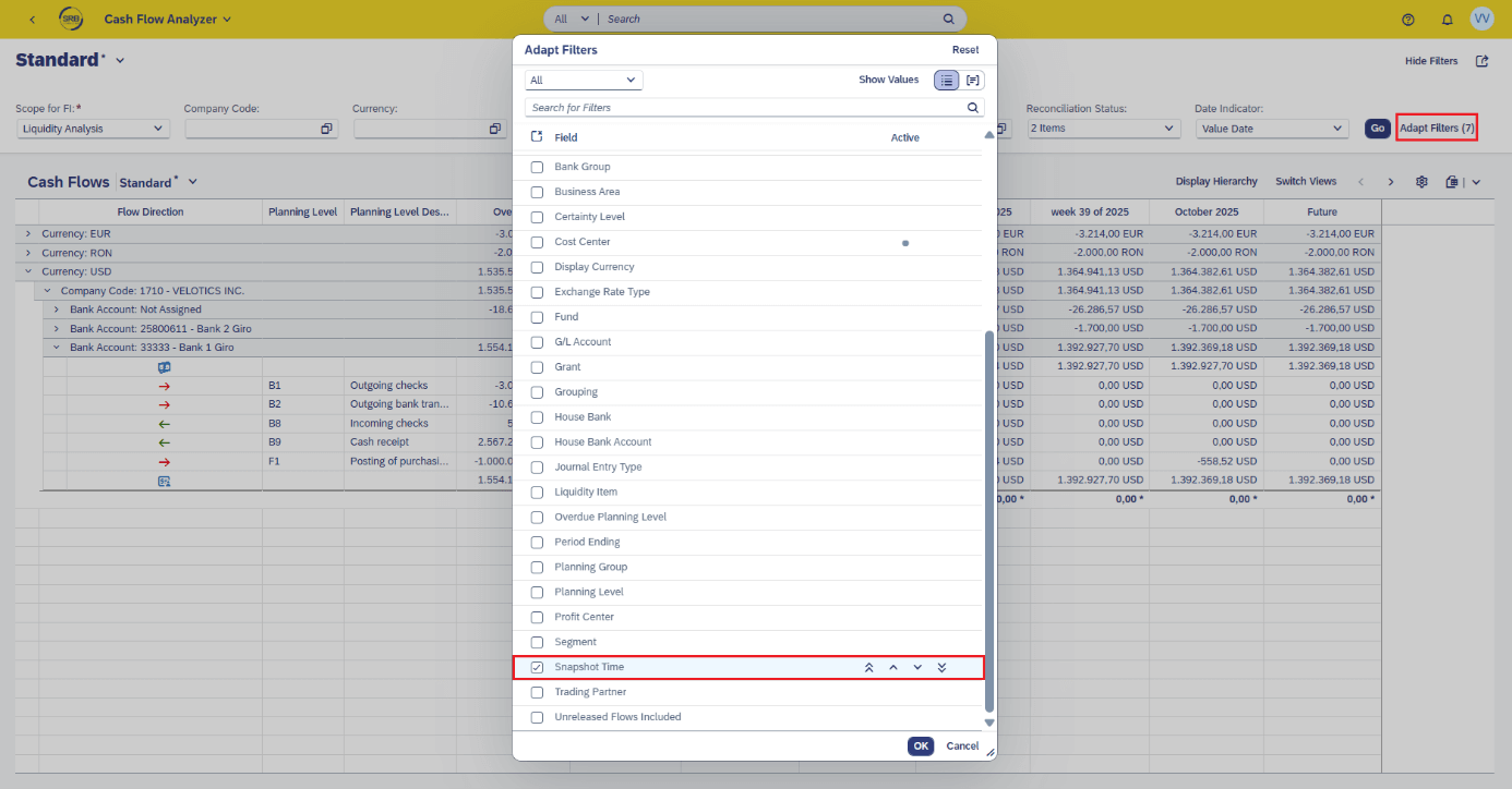 5.    Der Filter Snapshot Time ist ein besonderes Highlight. Damit lassen sich Cashflows zu einem bestimmten Zeitpunkt in der Vergangenheit anzeigen. Über Adapt Filters Button kann dieser Filter in den Filterbereich eingeblendet werden.