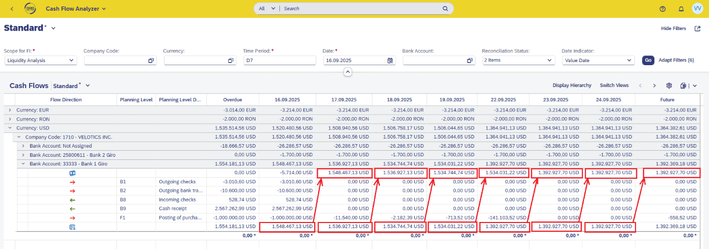 Balance View (Saldensicht) zeigt den Anfangs- und Endsaldo unter Berücksichtigung aller kumulierten Cashflows. Der Endsaldo eines Tages wird als Anfangssaldo des Folgetages übernommen.