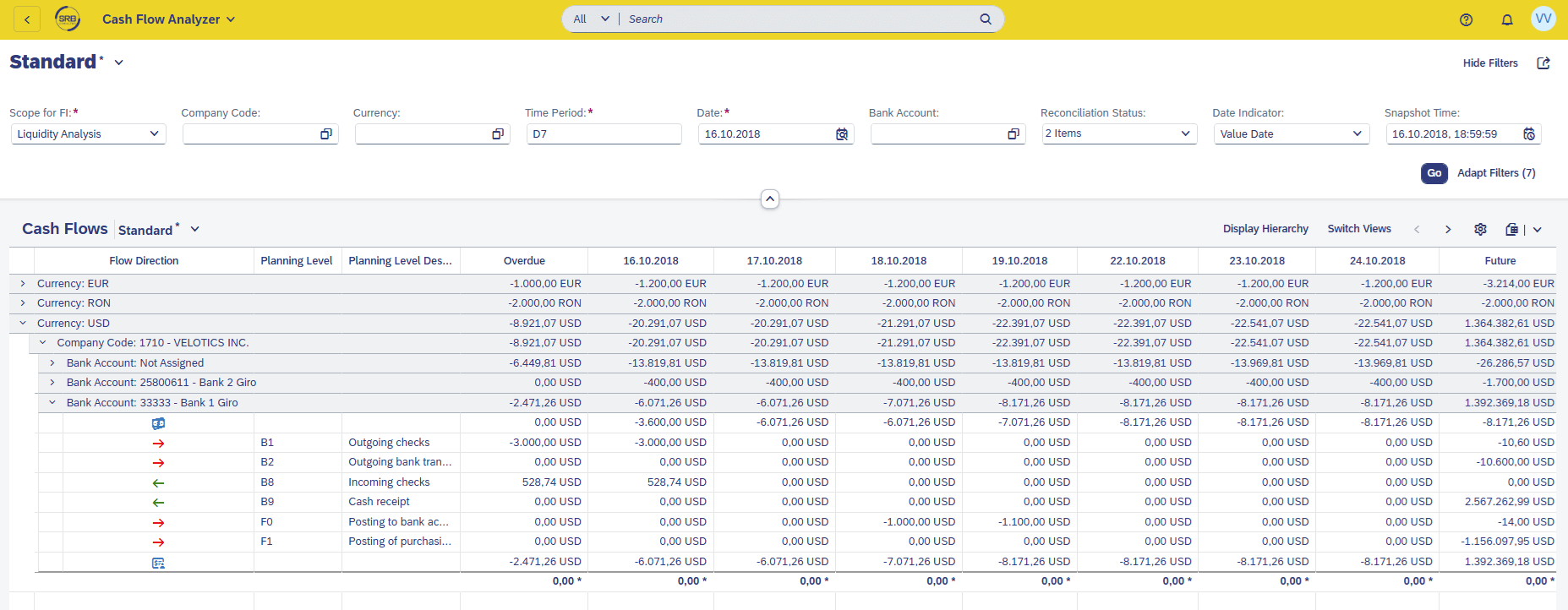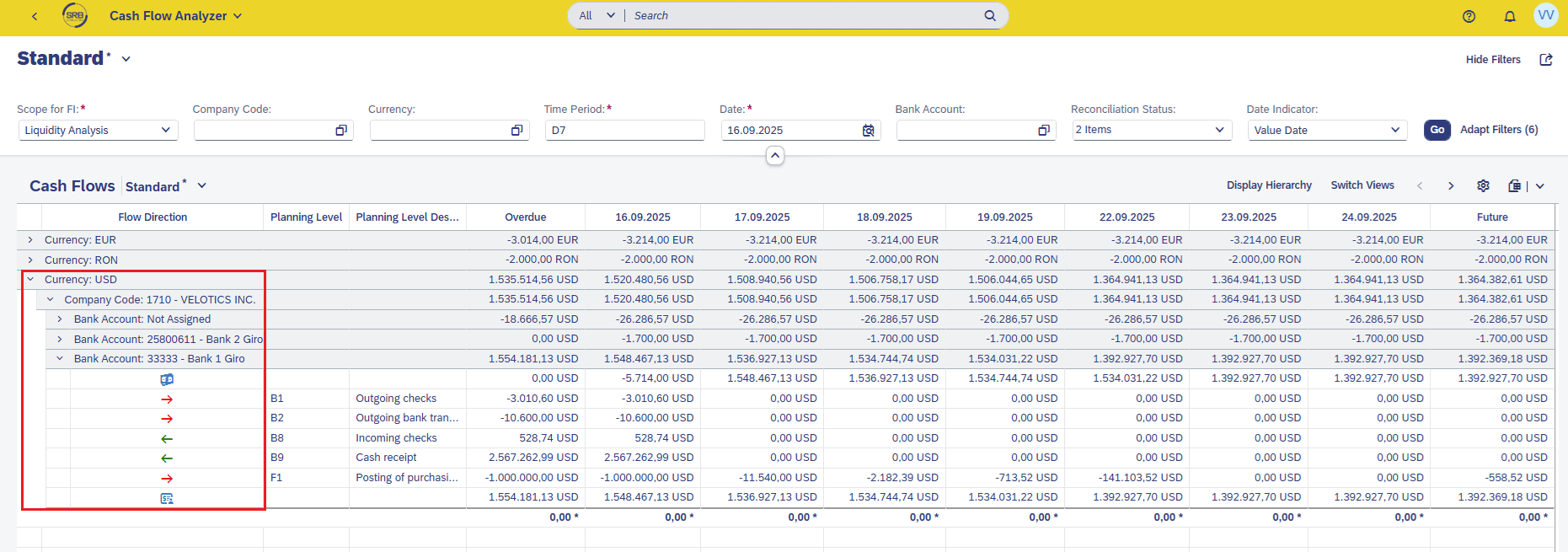 Die Standardaggregation im Bericht erfolgt nach Währungen, Unternehmen und Bankkonten. Wobei die Symbole "roter Pfeil rechts" und "grüner Pfeil links" die Outflows und Inflows darstellen und "Geldscheine" sowie "Dollar Zeichen mit Person" den In- bzw. Out-Saldo.