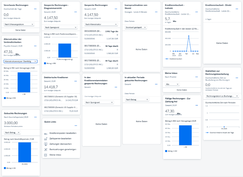 „Übersicht der Kreditorenbuchhaltung“ (F2917) klingt beim ersten Hinhören trocken. Erst wenn man genauer hinschaut, erkennt man das Potenzial dieser SAP Fiori App. F2917 ist nämlich deshalb so stark, weil sie die Kreditorenbuchhaltung erstmals als echtes Cockpit erlebbar macht: Statt nur Listen und Einzeltransaktionen zu liefern, bündelt die App alle relevanten KPIs und Grafiken auf einer Oberfläche und zeigt sofort, wo es brennt – überfällige Posten, Sperren, Auffälligkeiten. Diese visuelle, verdichtete Sicht gibt es im klassischen SAP‑GUI in dieser Form nicht. F2917 macht damit Schluss mit verstreuten Reports und zahllosen Einzeltransaktionen, die man aus dem klassischen GUI kennt.