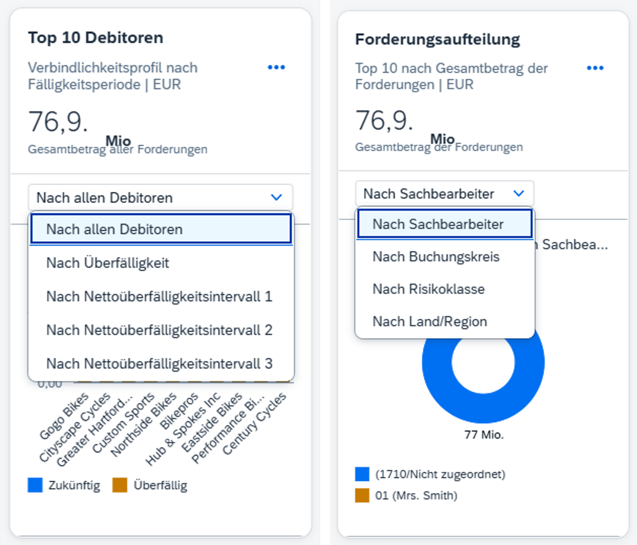 Ein konkretes Beispiel aus der Praxis belegt dies eindrücklich: Ein Klick von der Karte „Altersstrukturanalyse“ in die App „Gesamtforderungen“ und dort die Ansicht „Nach Top 10 Debitoren“ wählen, um die Altersstruktur der Forderungen genau dieser Debitoren zu sehen.